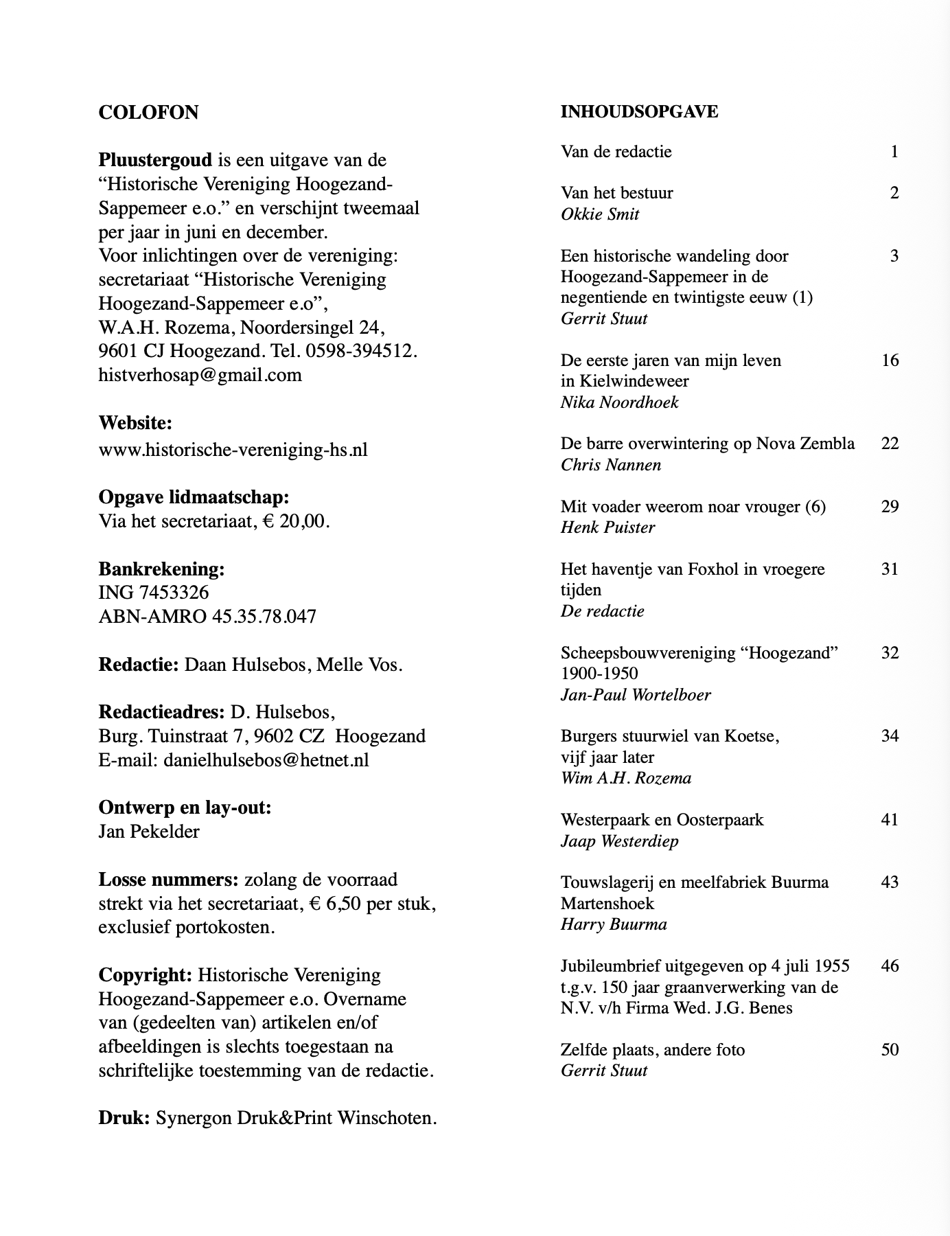 Verder het vervolg van het artikel in Pluustergoud nummer 35 van Chris Nannen over de belevenissen van kapitein Dijkstra uit Hoogezand en de overwintering op Baffin Land terwijl Gerrit Stuut met u een historische wandeling gaat maken door Hoogezand-Sappemeer in de negentiende en de twintigste eeuw.