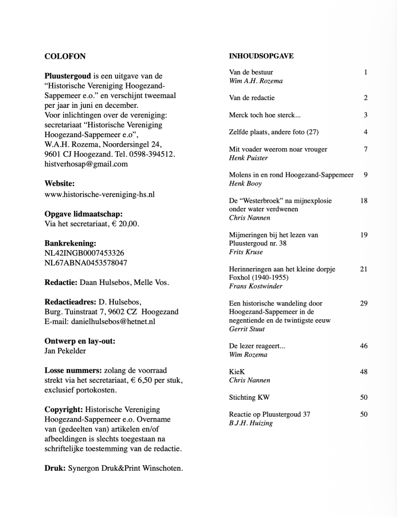 Pluustergoud nummer 39 van juni 2014 bevat weer een gevarieerd aanbod van artikelen. Naast de vaste rubrieken die in elk nummer terugkomen te weten de bijdrage van het bestuur, “zelfde plaats, zelfde foto” van Gerrit Stuut, “Mit voader weerom noar Vrouger” van Henk Puister en de rubriek KieK, treft u in dit nummer het tweede deel aan van de door Henk Booij geschreven reeks van drie artikelen over molens in Hoogezand-Sappemeer en het vierde en laatste deel van een wandeling door Hoogezand-Sappemeer in de negentiende en twintigste eeuw van Gerrit Stuut. Deze laatste keer wandelt hij door Foxham en Foxhol.
