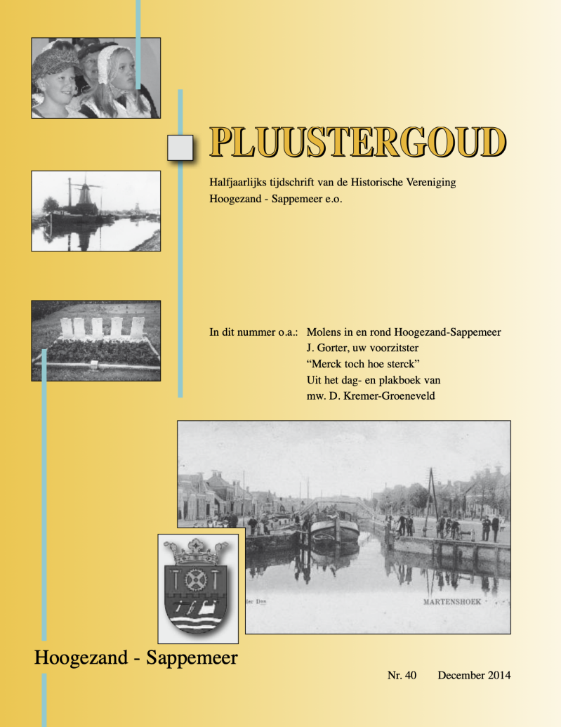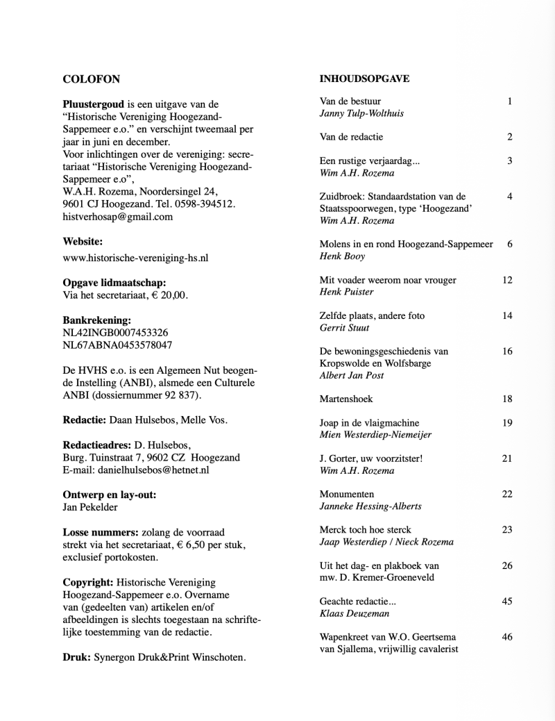 Wederom een mijlpaal in de geschiedenis van de Historische Vereniging Hoogezand-Sappemeer, de veertigste editie van Pluustergoud is uit. En nog steeds mogen wij als redactie ons verheugen op voldoende bijdragen van diverse kanten. Onze dank daarvoor en blijf inzenden. In dit nummer zoals altijd weer een variatie aan uiteenlopende onderwerpen. Naast de bijdragen van onze vaste inzenders Gerrit Stuut (Zelfde plaats, andere foto) en Henk Puister (Mit voader weerom noar vrouger), het beloofde derde deel over Molens in Hoogezand-Sappemeer van Henk Booij met als onderwerp de Polder of Watermolens en enkele wetenswaardigheden over molens.