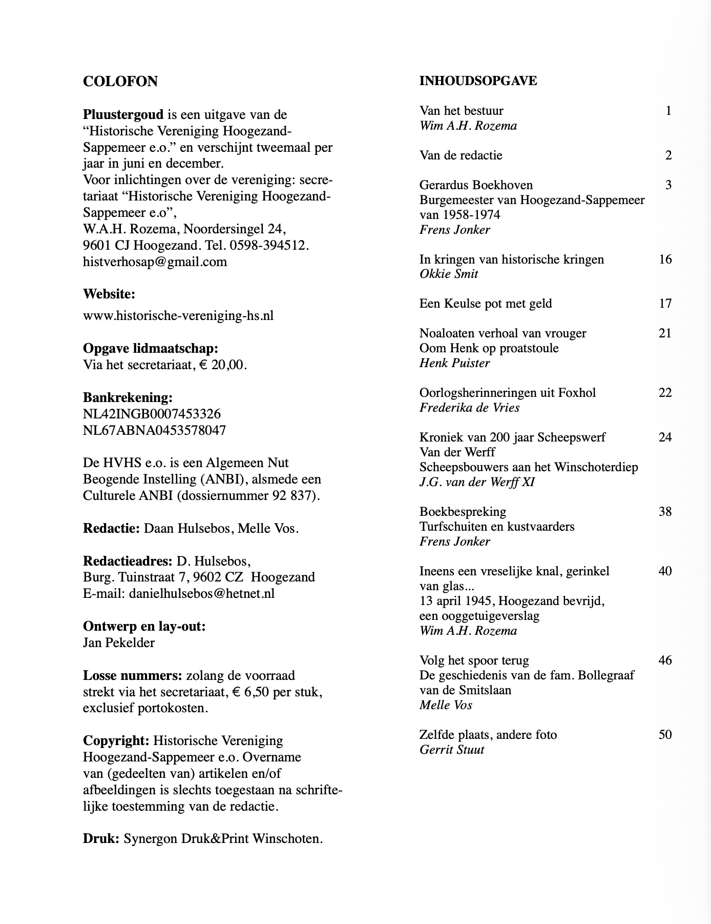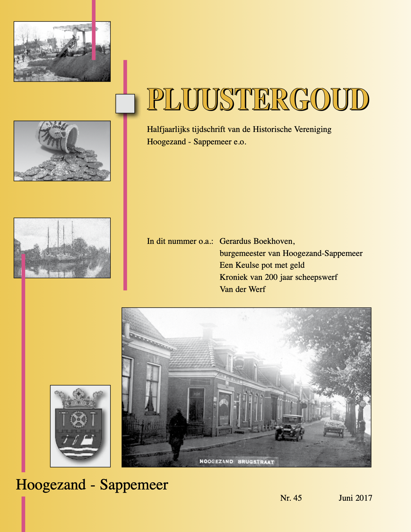 In Pluustergoud nummer 45 vindt u een groot aantal artikelen voor elk wat wils. Naast de vaste rubrieken “van het bestuur” en “zelfde plaats, andere foto” een verhaal van Henk Puister onder de titel “n Noaloaten verhoal van vrouger”. Frens Jonker heeft het voor veel van de lezers herkenbare indrukwekkende levensverhaal van Gerardus Boekhoven, burgemeester van de gemeente Hoogezand-Sappemeer tussen 1958 en 1974, aangeleverd. Melle Vos bezocht de concentratie- en vernietigingskampen Auschwitz en Birkenau en volgde het spoor terug van de Hoogezandster Joodse familie Bollegraaf die daar op afschuwelijke wijze om het leven is gebracht.