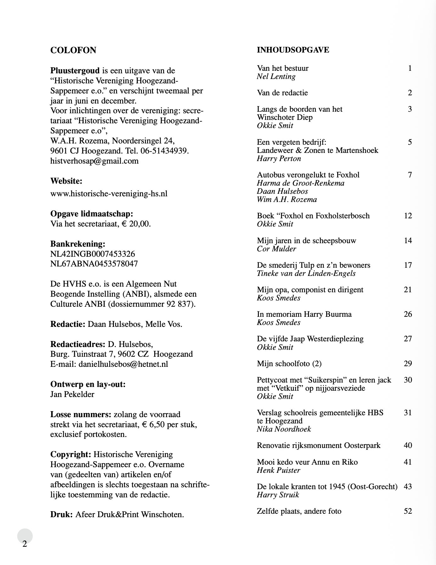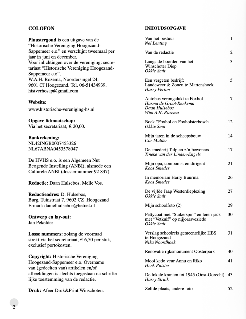Tineke van der Linden schreef een artikel over smederij Tulp en zijn bewoners terwijl Wim Rozema met medewerking van Harma de Groot, die krantenknipsels en briefkaarten aanleverde, verhaalt van een busongeluk in Foxhol in december 1946 waarbij drie mensen omkwamen.