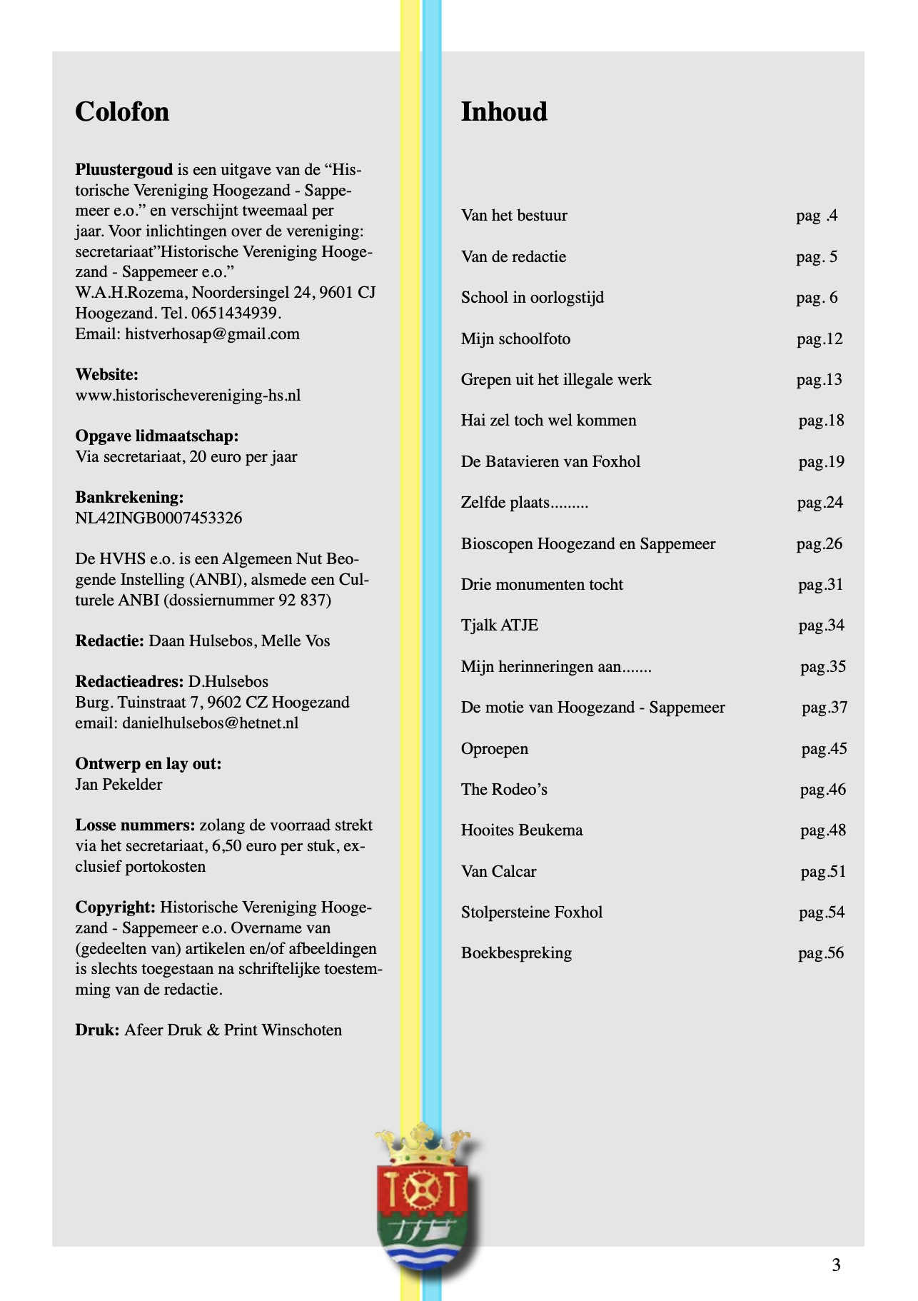 Nadat het 53e editie bestuur u onlangs heeft verrast met het boek “Plekken van Herinnering” ligt voor u alweer de van Pluustergoud. Naast de vaste rubrieken “Zelfde plaats, Andere foto”, zoals gewoonlijk aangeleverd door Gerrit Stuut, en de rubriek “Mijn schoolfoto”, waarvoor u nog steeds materiaal kunt insturen, treft u in dit nummer veel verschillende gevarieerde bijdragen van leden en niet leden.Allereerst een bijdrage van ons lid Mien Westerdiep, die herinneringen ophaalt aan haar jeugd waarin zij voor een belangrijk deel gevormd werd door hetgeen haar in de doopsgezinde kerk werd bijgebracht.